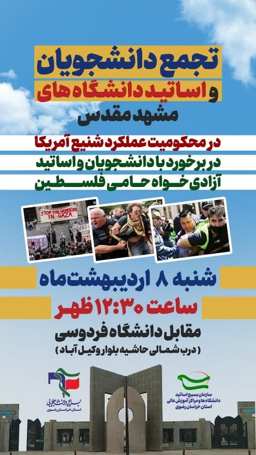 تجمع دانشجویان و اساتید دانشگاه های مشهد مقدس در محکومیت عملکرد شنیع آمریکا در برخورد با دانشجویان و اساتید آزادی خواه حامی فلسطین برگزار می شود.